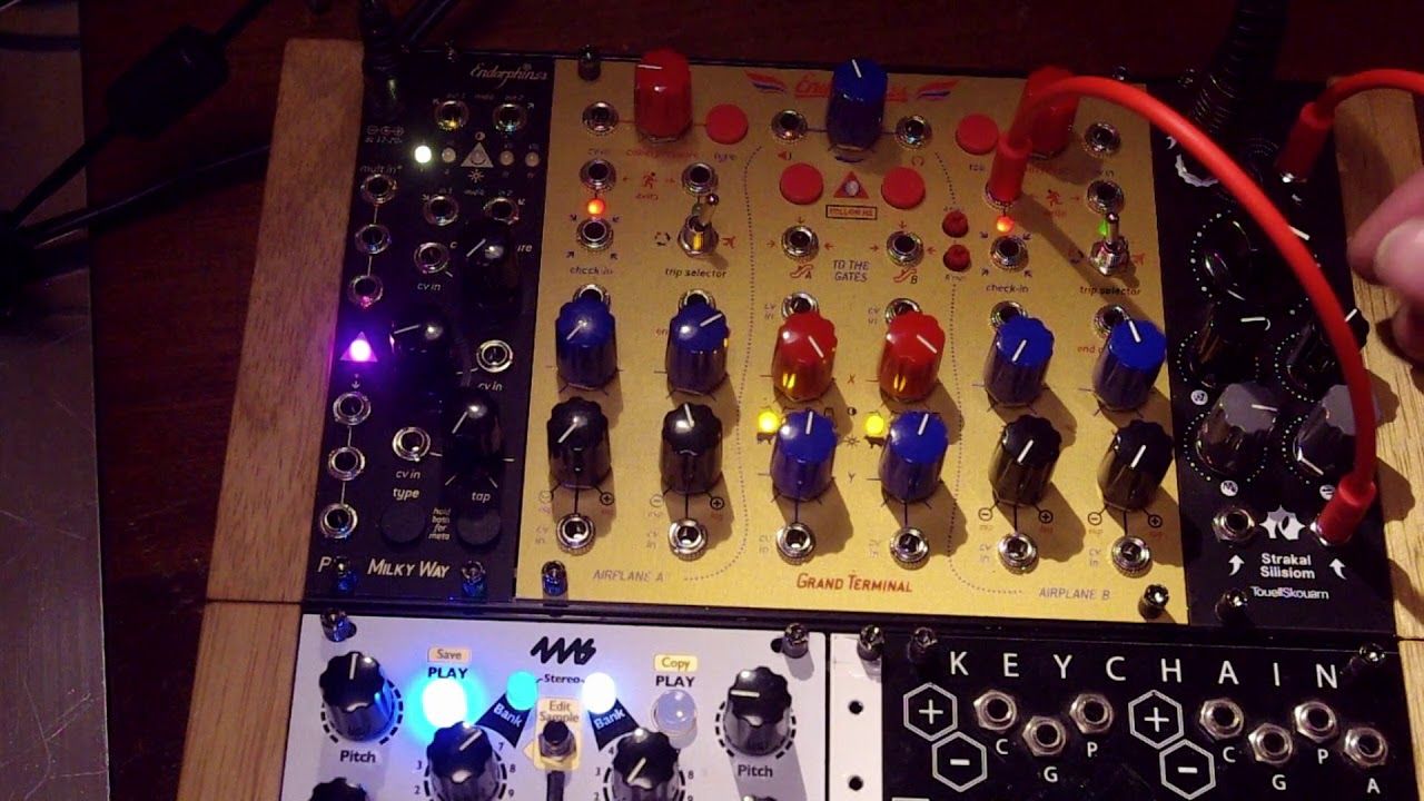 This patch has a LFO modulating the Antumbra Knit (a miniature Mutable Instruments Plaits) which has a single low frequency saw wave triggering the filter pings. Both cores of the filter are in use and spread with the stereo control. After the filter it goes to a miniature Clouds.