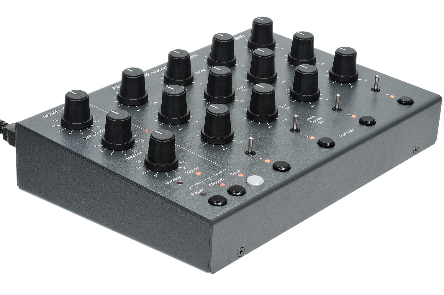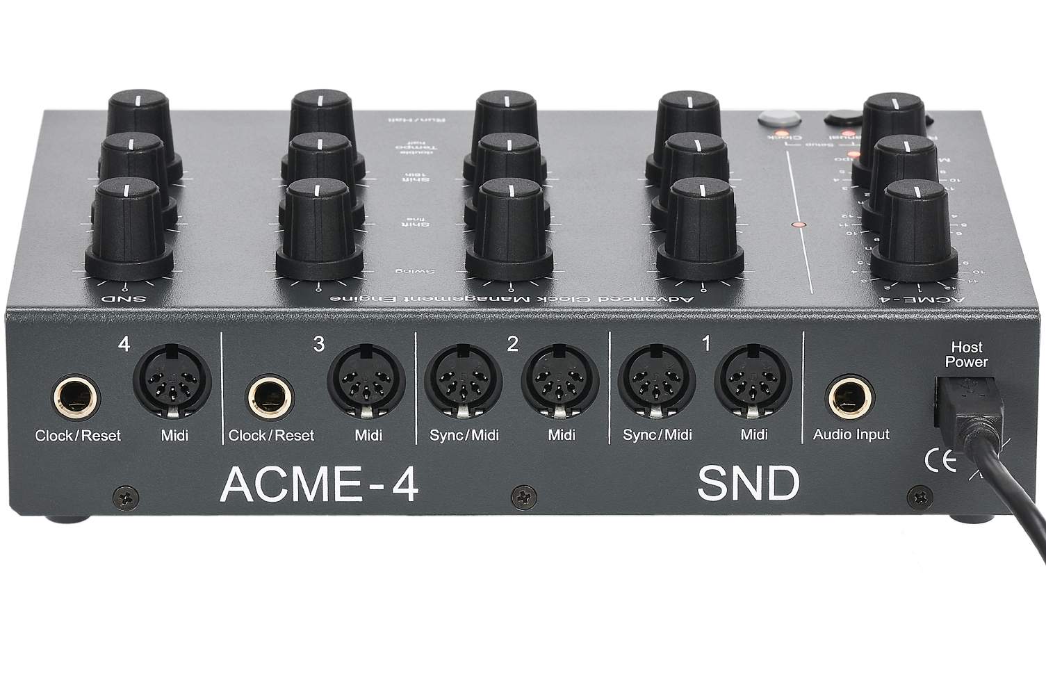 SNDs neuestes Gerät namens ACME4 ist ein professionelles Zentralsteuersystem für Musiksynchronisationssignale. Die Abkürzung ACME steht für "Advanced Clock Management Engine". Es ist das einzige Gerät der Welt, das eine MIDI-Master-Clock erzeugt, die absolut jitterfrei ist!