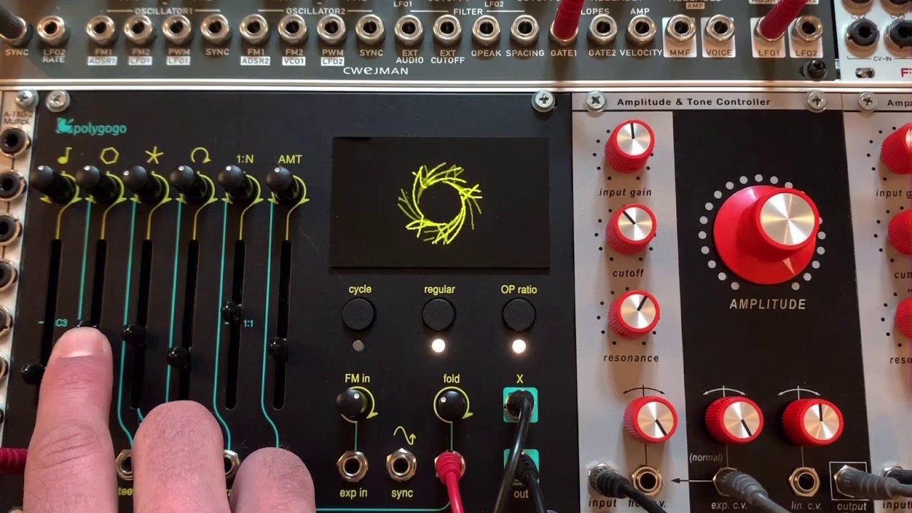 Die Polygonsynthese beruht stark auf der Interaktion zwischen dem Benutzer und dem polygonalen Objekt hinter dem OLED-Bildschirm. Aus der Anzahl der Knoten (Order) und deren Verschiebung (Teeth) werden der Grundton und das harmonische Verhältnis gebildet. Die Rotationsmodulation (Roll) schwenkt den Klang im Stereofeld oder wirkt wie ein Vibrato. Der interne lineare FM-Operator (OP ratio / OP amt) kann die Grundfrequenz und ihren hohen Spektralgehalt modulieren. Eine analoge Überlaufstufe am Ausgang (Fold) kann als Wellenfalter fungieren. - So gibt es den Klängen den letzten Schliff direkt vor dem Ausgang (X/Y).