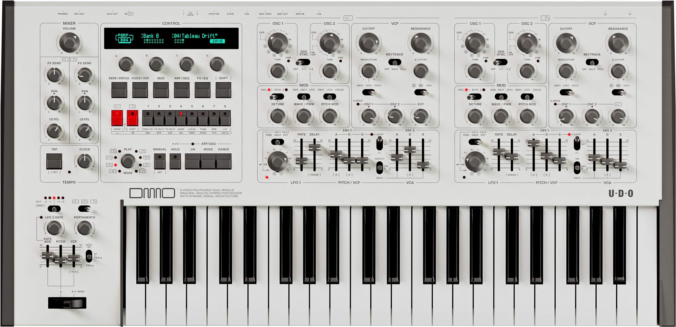 DMNO is an 8-voice, 2-part multi-timbral powerhouse with a highly flexible and dynamic signal architecture. It features two fully independent 4-voice analog-hybrid synthesizers, each equipped with our new Dynamic Multi-Core Stereo VCF. With its eight creative Play Modes, DMNO unlocks dynamic interactions between the two timbres at the touch of a single control, while its flexible analog and digital audio connectivity makes it a truly expansive and immediate sound design sandbox.