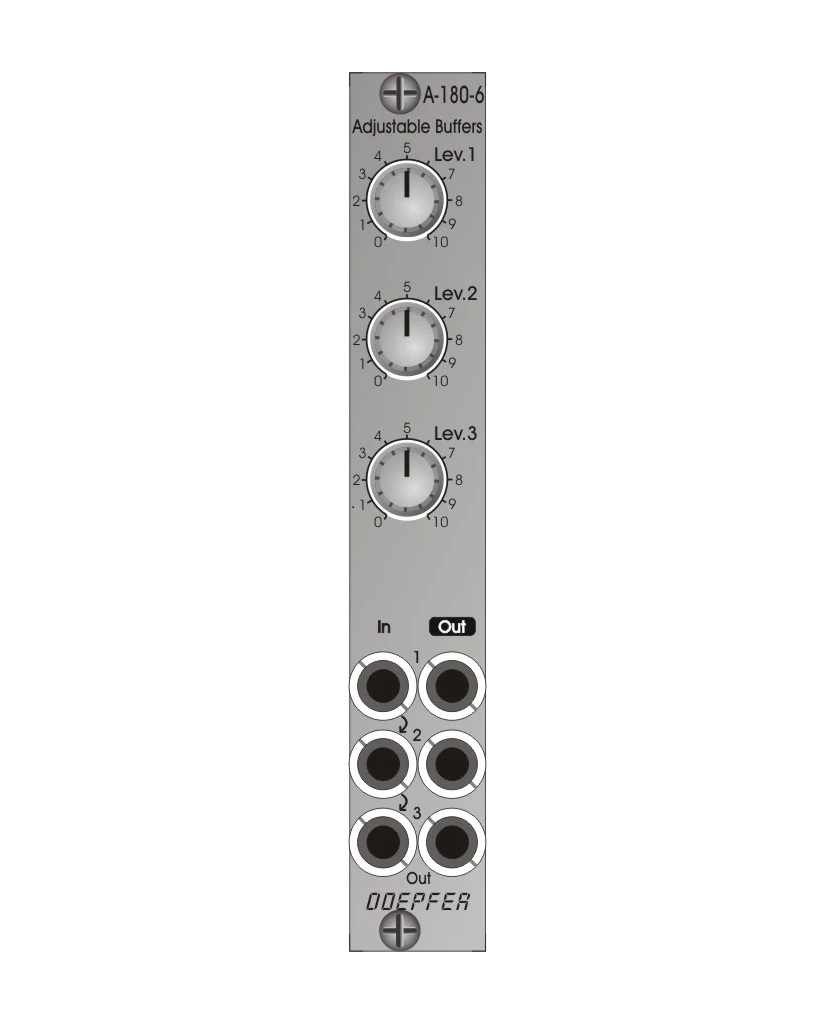The A-180-6 module is a triple buffer module in which the gain of each unit can be adjusted separately.