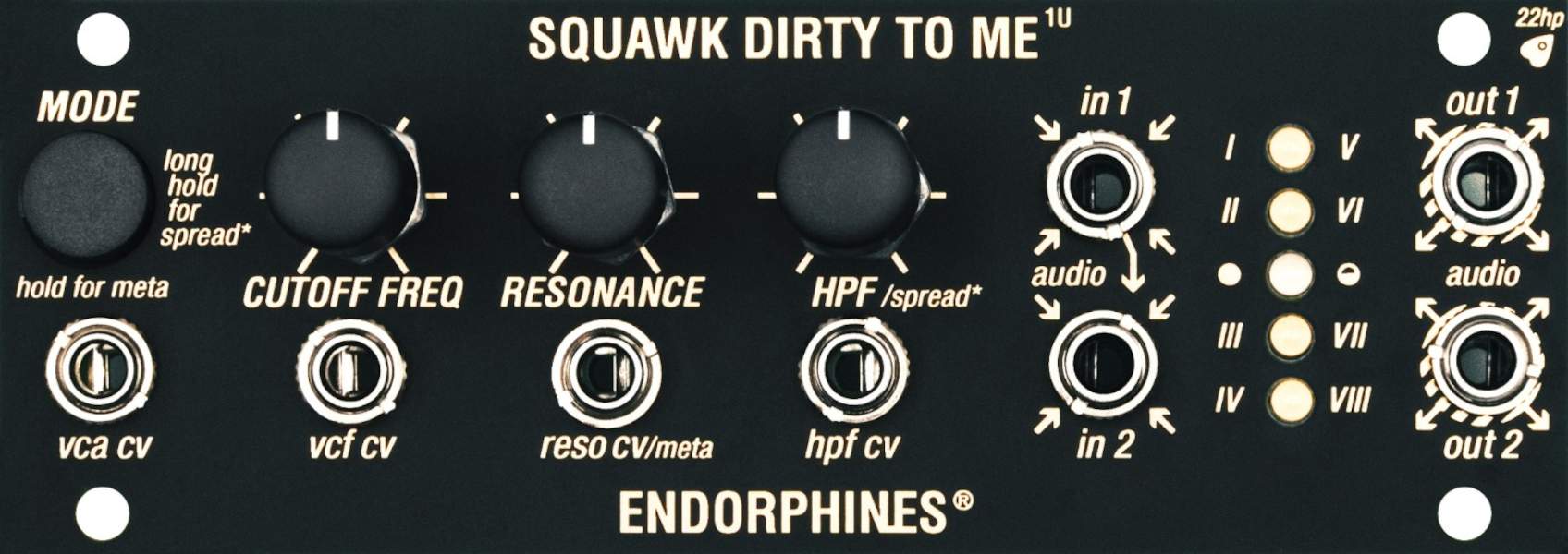 Der Squawk Dirty To Me 1U ist ein Stereofilter mit spannungsgesteuerter Resonanz. Es verfügt über 8 Filtermodi und eine verzögerungsfreie Rückkopplung.