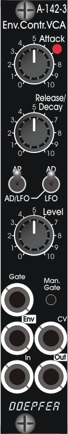 Das Modul A-142-3 ist auch in einer Vintage-Edition erhältlich, bei der es sich um eine Einzelversion des 142-2 handelt. Es kombiniert einen VCA und einen AD/AR-Hüllkurvengenerator, der auch als LFO fungieren kann, und ist hinter einer 4-HP-Frontplatte untergebracht.