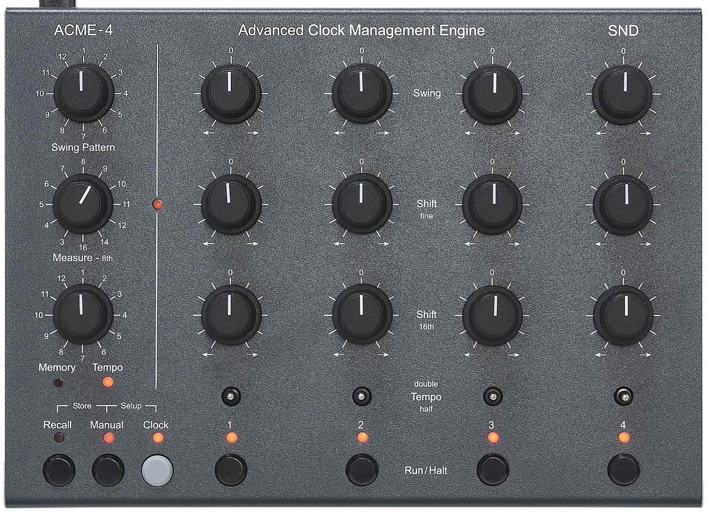 SNDs neuestes Gerät namens ACME4 ist ein professionelles Zentralsteuersystem für Musiksynchronisationssignale. Die Abkürzung ACME steht für "Advanced Clock Management Engine". Es ist das einzige Gerät der Welt, das eine MIDI-Master-Clock erzeugt, die absolut jitterfrei ist!