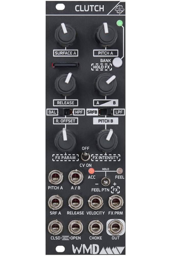 Clutch ist ein Dual-Sample-Player, der speziell für die Erzeugung dynamischer Hi-Hat-Sounds entwickelt wurde und über eine intuitive Benutzeroberfläche verfügt. Es ist möglich bis zu 8x16 Bänke mit Hats auf einer Speicherkarte zu speichern.