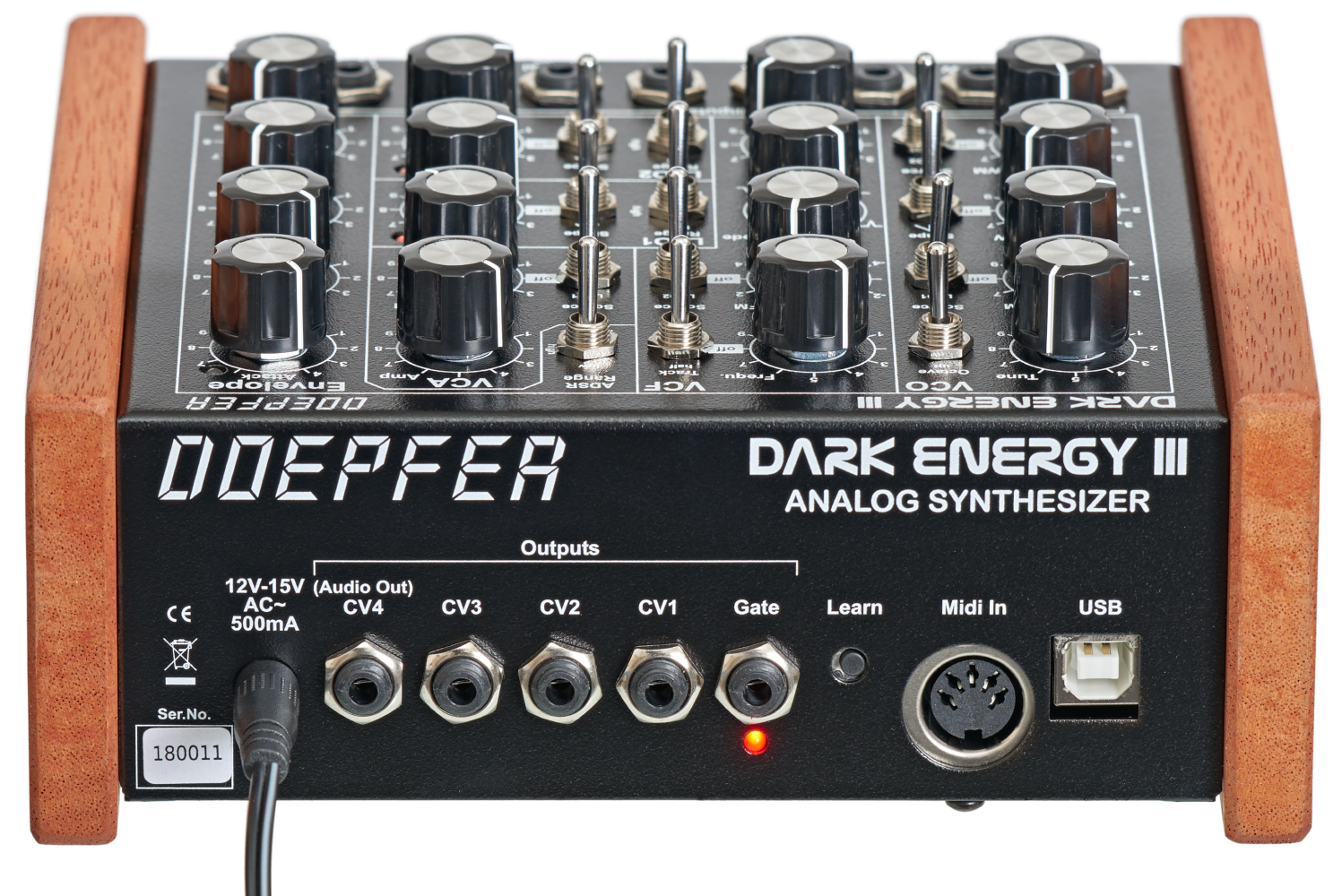 Dark Energy III is a monophonic stand-alone synthesizer with USB and Midi interface. The sound generation and all modulation sources are 100% analog, only the USB/Midi interface contains digital components. Dark Energy is built into a rugged black metal case with wooden side plates. High quality potentiometers with metal shafts are used and each potentiometer - except the filter mode control - is fixed to the case (no wobbly shafts and knobs). The distance between the controls is a bit wider compared to A-100 modules and knobs with vintage look are used.